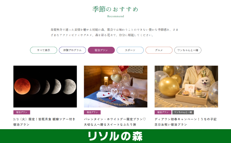 リソルの森が季節のおすすめとして提供する「宿泊プラン」をご紹介します。