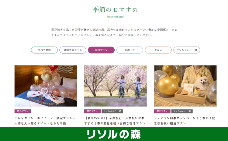 リソルの森が季節のおすすめとして提供する「宿泊プラン」をご紹介します。